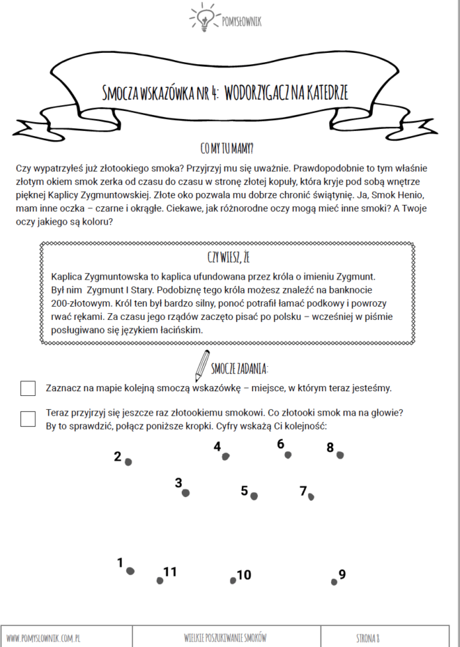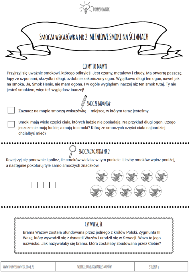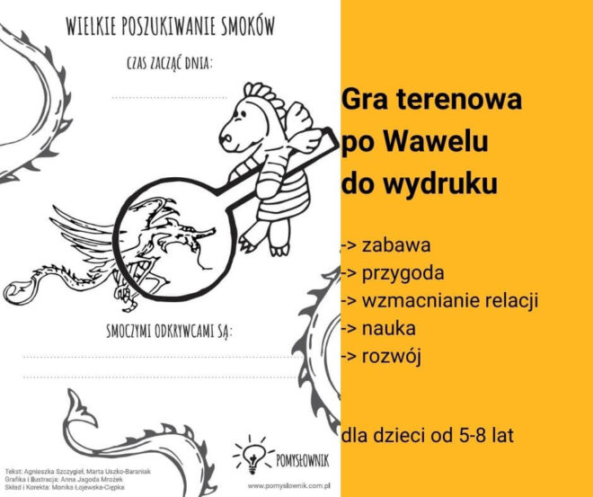 to przygoda, którą dziecko może przeżyć razem ze swoimi bliskimi na najsłynniejszym polskim wzgórzu. Dzięki fabule gry dziecko z zaangażowaniem tropi i odnajduje smoki skryte na Wawelu. Rozwiązuje zagadki, szuka smoczych wskazówek mimochodem chłonąc wiedzę z zakresu sztuki i historii Polski. Podczas rodzinnej gry dziecko uczy się orientacji w terenie, trenuje pracę z mapą, ćwiczy uważność i umiejętności analityczne.